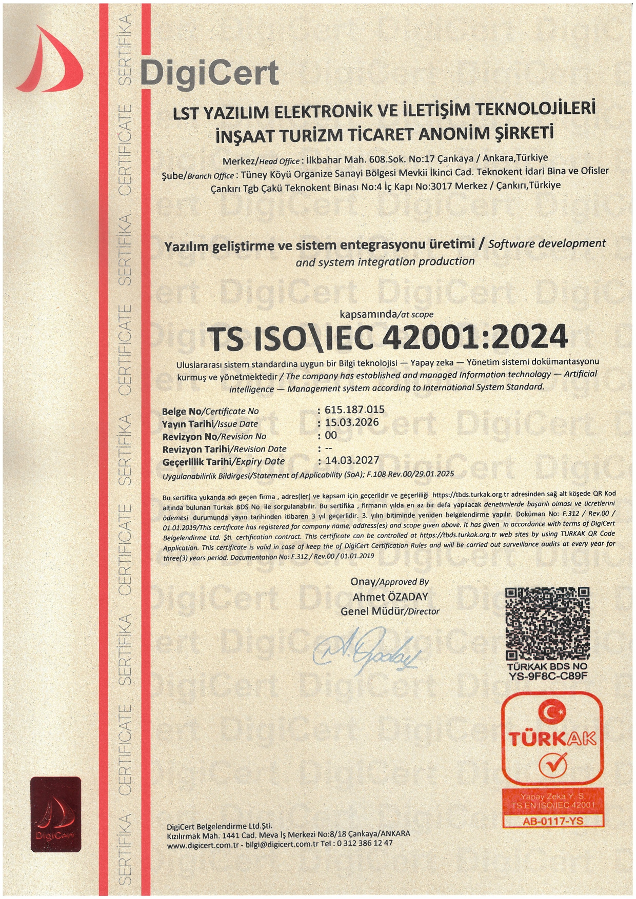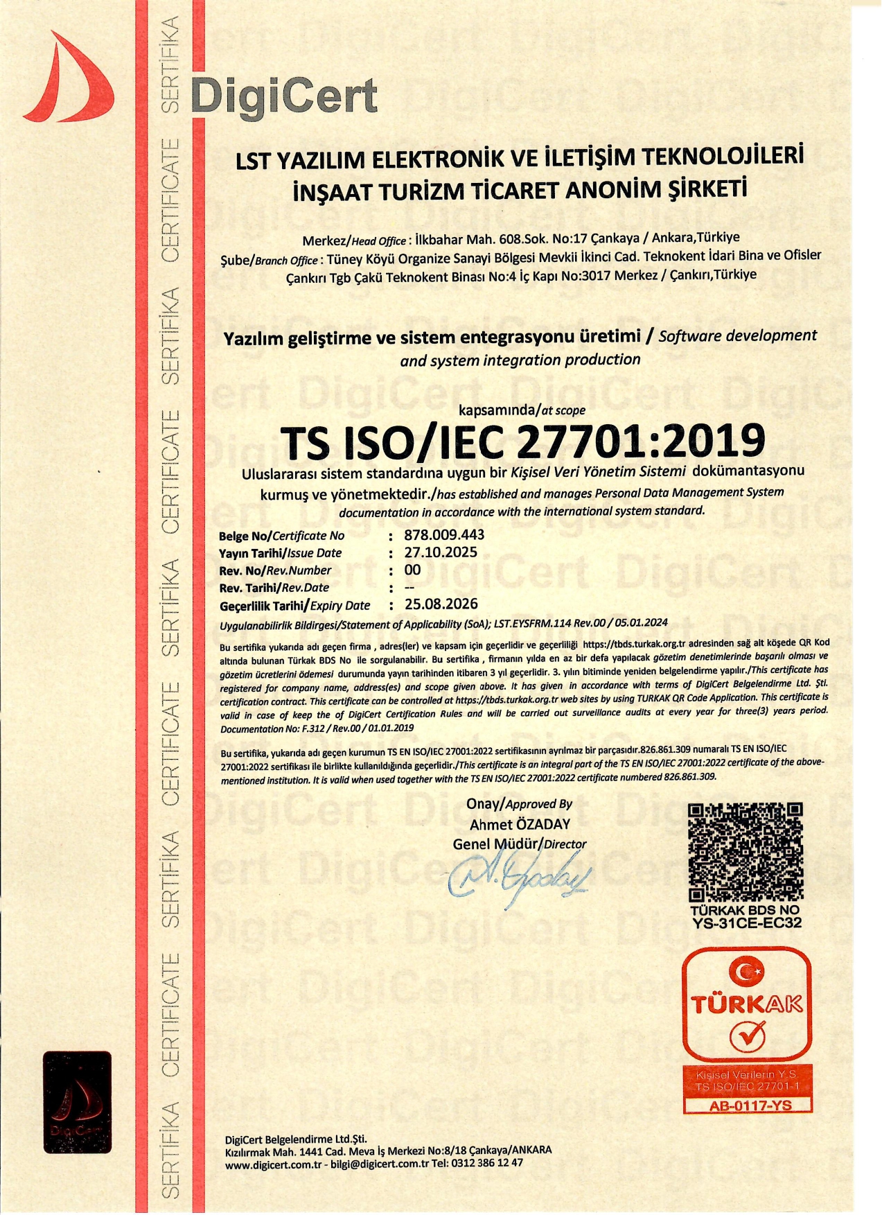 LST Yazılım olarak tüm projelerimizi uluslararası kalite standartlarına uygun şekilde yürütüyor, güvenilir ve sürdürülebilir çözümler sunuyoruz. Sahip olduğumuz kalite ve süreç yönetim belgeleri, müşterilerimize verdiğimiz hizmetin şeffaf, güvenli ve ölçülebilir olduğunu kanıtlamaktadır.